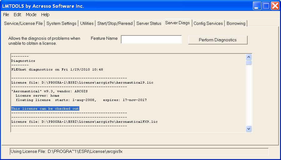 16 – تب Server Diags را انتخاب کنید و بر روی تکمه Perform Diagnostics کلیک کنید .لحظه ای صبر کنید . چنانچه تمام مراحل را به درستی انجام داده باشید باید جمله The Liscence can be check out را مشاهده نمایید .